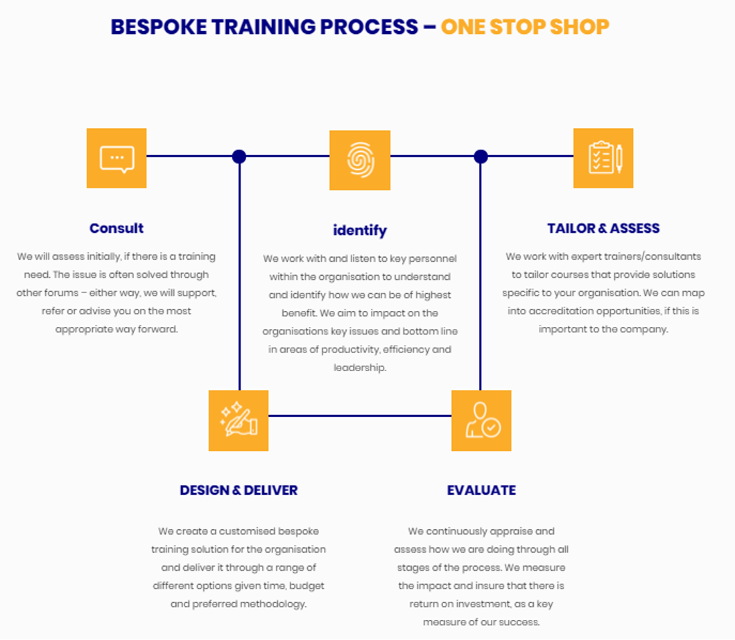 As an outcome of the initial consultancy service, we can identify the key priorities and critical issues preventing progression within the organisation. Often times, training can address these gaps. Much of this training is non-accredited and customised towards the needs of individual learners in organisations and organisational succession planning.